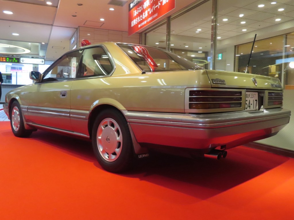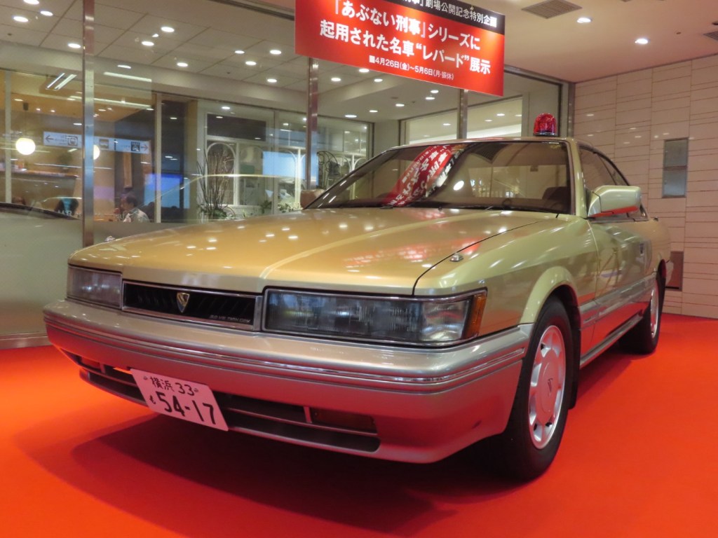 まずはこちら、あぶない刑事のもう一つの主役と言っても良い日産F31レパードです。あぶデカでは、恭兵さんが演じるユージ(大下勇次)と舘さんが演じるタカ(鷹山敏樹)が乗る横浜港署捜査課の覆面車として登場し、一躍人気となった2ドアクーペであり最上級グレードのアルティマが採用されました。写真はゴールドツートンですが、作中ではダークブルーツートンも登場しています。ドラマ1作目から、1989年公開の映画3作目もっともあぶない刑事までは日産が協賛しており、レパードの他にもY31セドリックやA31セフィーロなどが港署の覆面車とし登場しています。